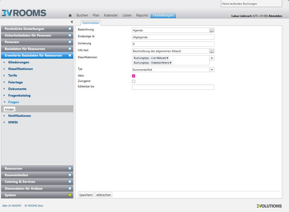 - Aktiv = ja: Die Frage kann in Fragenkatalogen genutzt werden und erscheint – sofern zugeordnet/relevant – in Buchungen.
