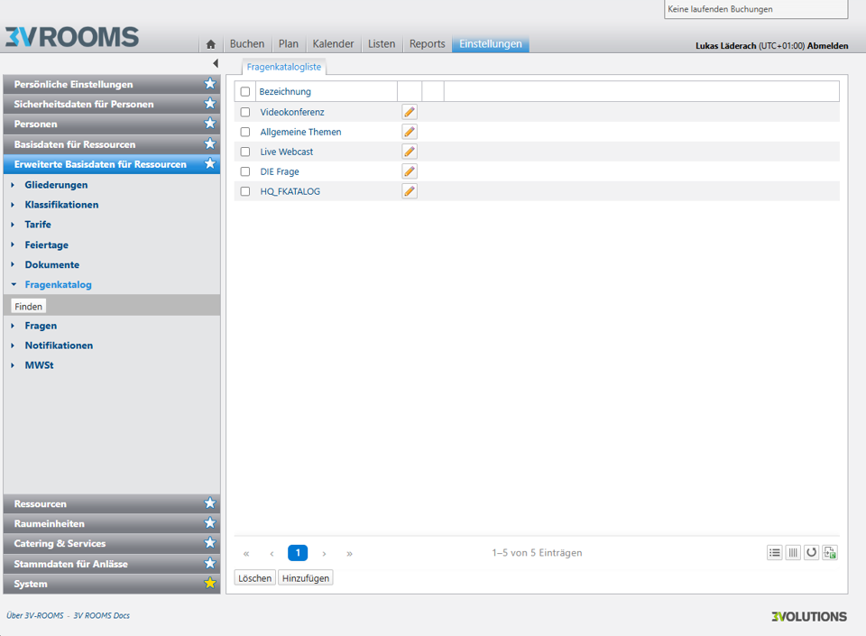 Mit dem Fragenkatalog definieren Sie einen Fragebogen, der bei Buchungen automatisch erscheint – z.B. um Informationen für Technik, Facility oder Empfang zuverlässig einzusammeln.
