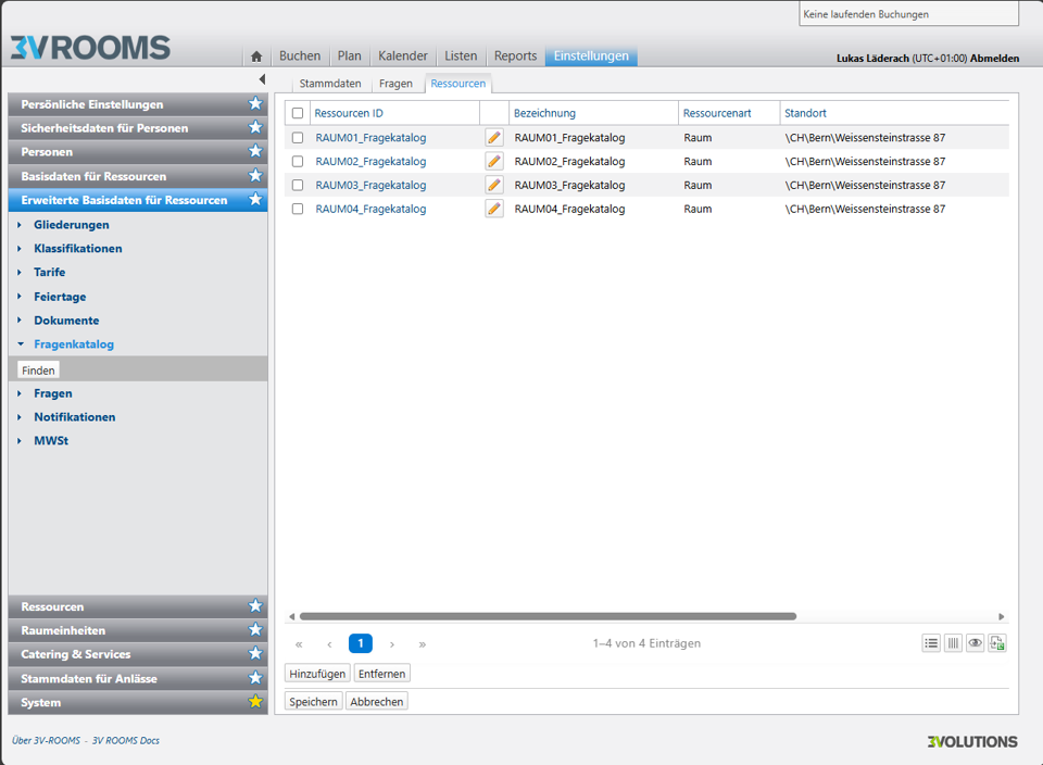 - Zuordnung zu Ressourcen: Bestimmt, bei welchen Ressourcen (typisch: Räume) der Fragenkatalog bei Buchungen relevant ist.