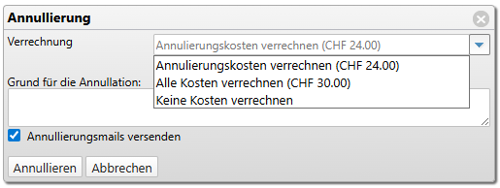 Falls der Benutzer die Berechtigung “Darf Reservationen mit Kosten editieren” hat, kann bei der Annullation einer Buchung angegeben werden, was mit den anfälligen Kosten auf der geschehen soll. Es gibt drei optionen: