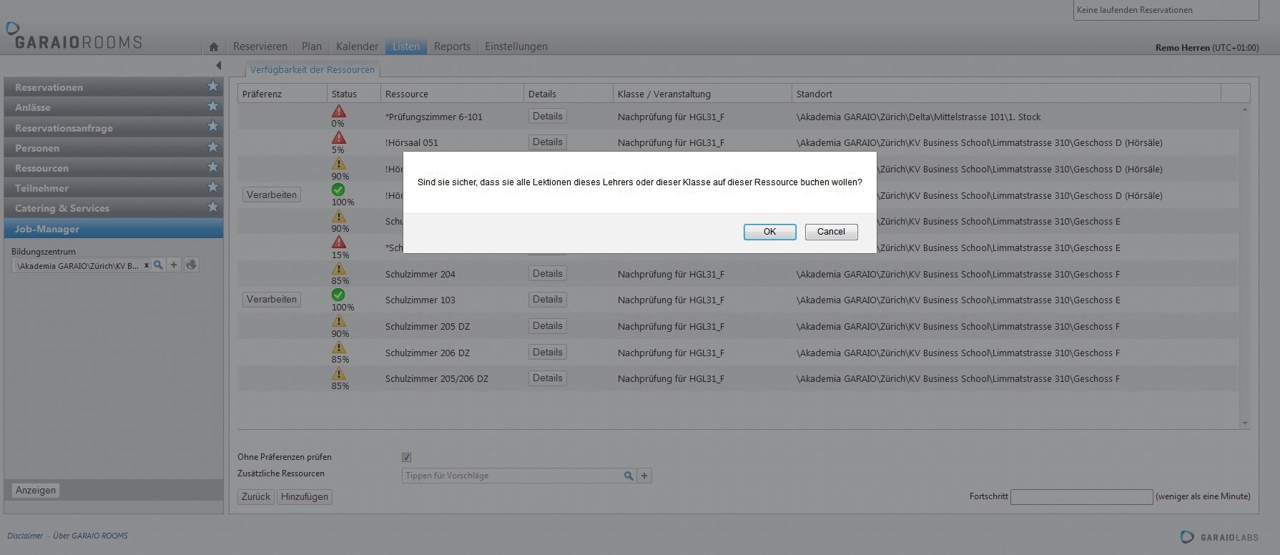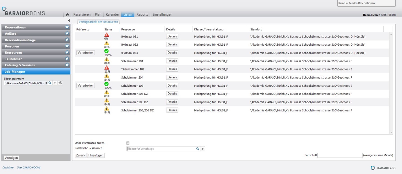 Nach dem Klick auf Prüfen zeigt der Jobmanager die Seite Verfügbarkeit der Ressourcen. Hier wird geprüft, welche Räume für die Lektionen des Jobs verfügbar sind.